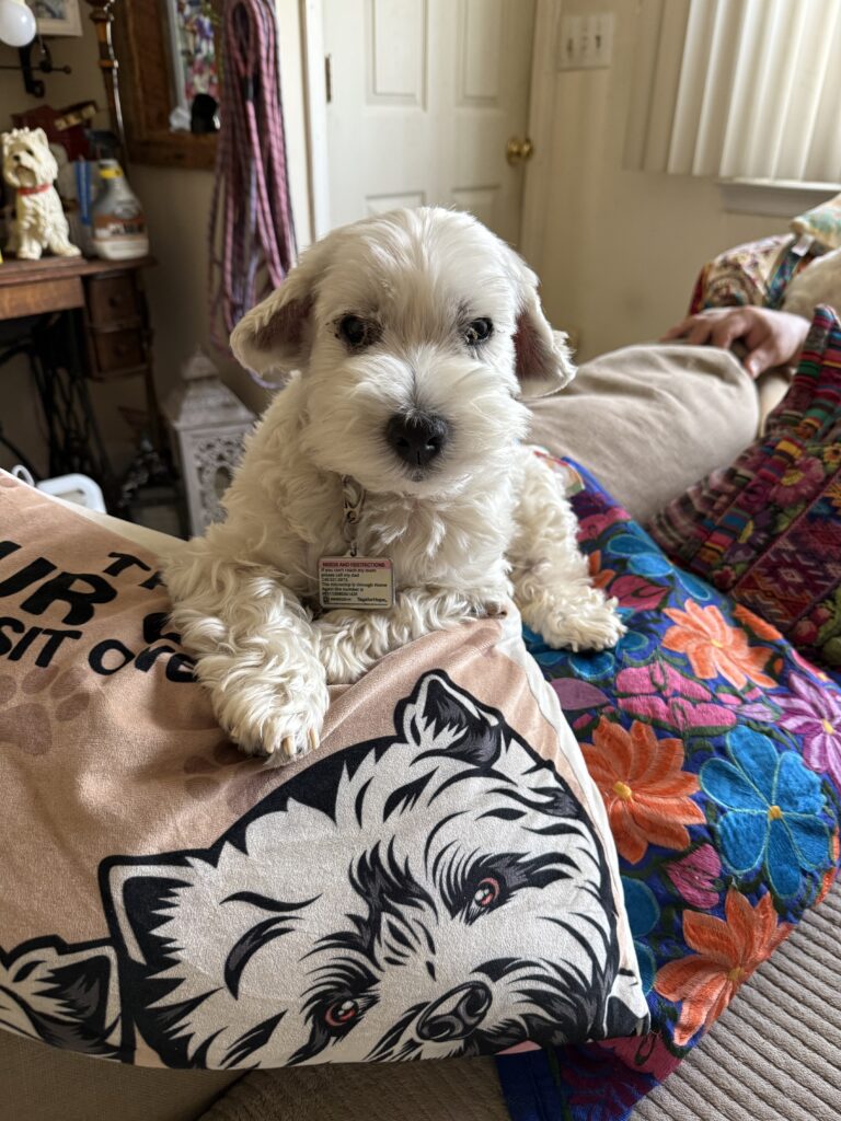 At ten years old, Mia has settled beautifully into her forever home. She adores cuddles, never says no to a treat, and finds pure joy in lounging under the sun and rolling in the grass like a carefree pup. While she doesn’t have the energy to chase around her two younger Westie sisters, they coexist peacefully as a cozy little trio. Over time, Mia’s appearance has changed—what was once classic Westie now has hints of white Schnauzer or maybe even a petite Wheaten Terrier, but her heart has remained just as pure. She still deals with pesky allergies (she is a Westie, after all!) and is on a special diet with daily Apoquel to help manage the symptoms. We’re currently exploring whether dry eyes might be affecting her too, and her vet will guide us on the next steps.
